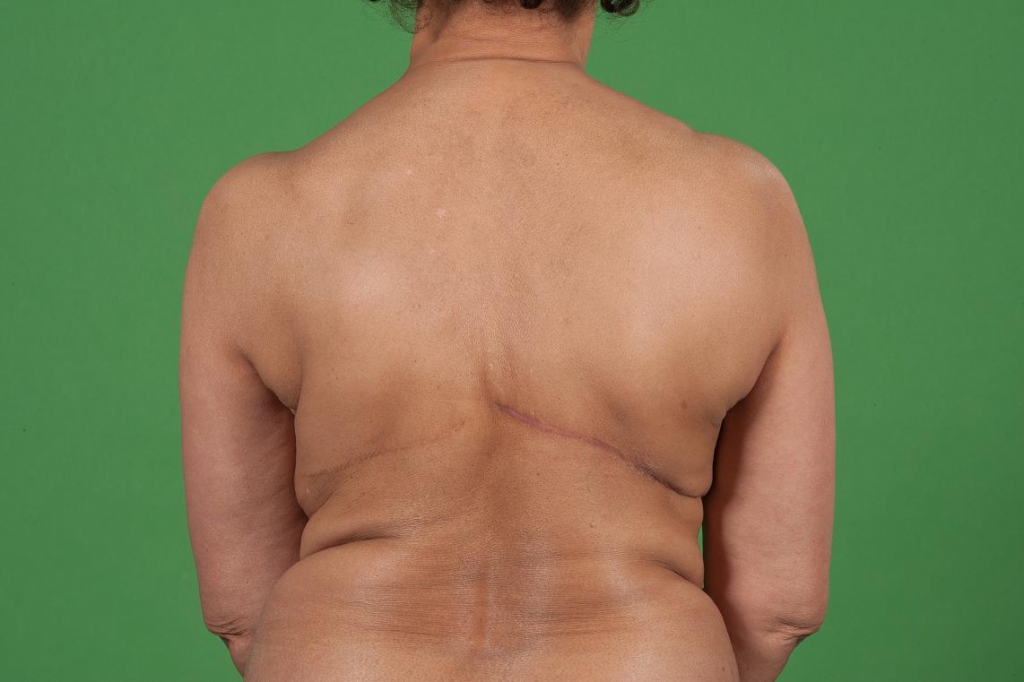 - Groot litteken aan de rugzijde (grotendeels gesitueerd onder de bh-band).