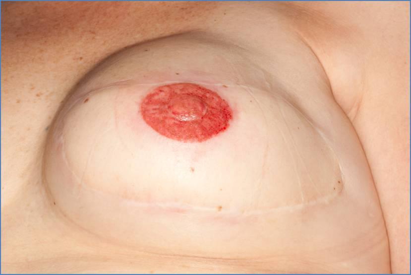 De tepel wordt meestal gereconstrueerd met twee of drie kleine flapjes afkomstig van de eigen huid. Dit leidt tot nieuwe kleine littekens. Deze littekens zullen echter gecamoufleerd worden door een tatoeage van het tepelhof en tepel. Soms kan de tepel gereconstrueerd worden door transplantatie van een gedeelte van de andere tepel. Dit natuurlijk enkel als deze groot genoeg is om een gedeelte te ontnemen.