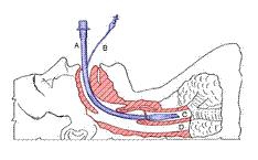 De beademingsbuis (A) loopt tussen de stembanden door. Er komt geen lucht meer langs de stembanden doordat de cuff (B) opgeblazen is. Het gevolg is dat de patiënt niet kan praten. Doordat de beademingsbuis achter in de keel de luchtweg (C) ingaat, is het slikken moeilijk. Voeding wordt daarom met een sonde via de slokdarm (D) in de maag gebracht. De tube wordt met een lintje om het hoofd bevestigd. Hierdoor wordt voorkomen dat de tube uit de mond losschiet.