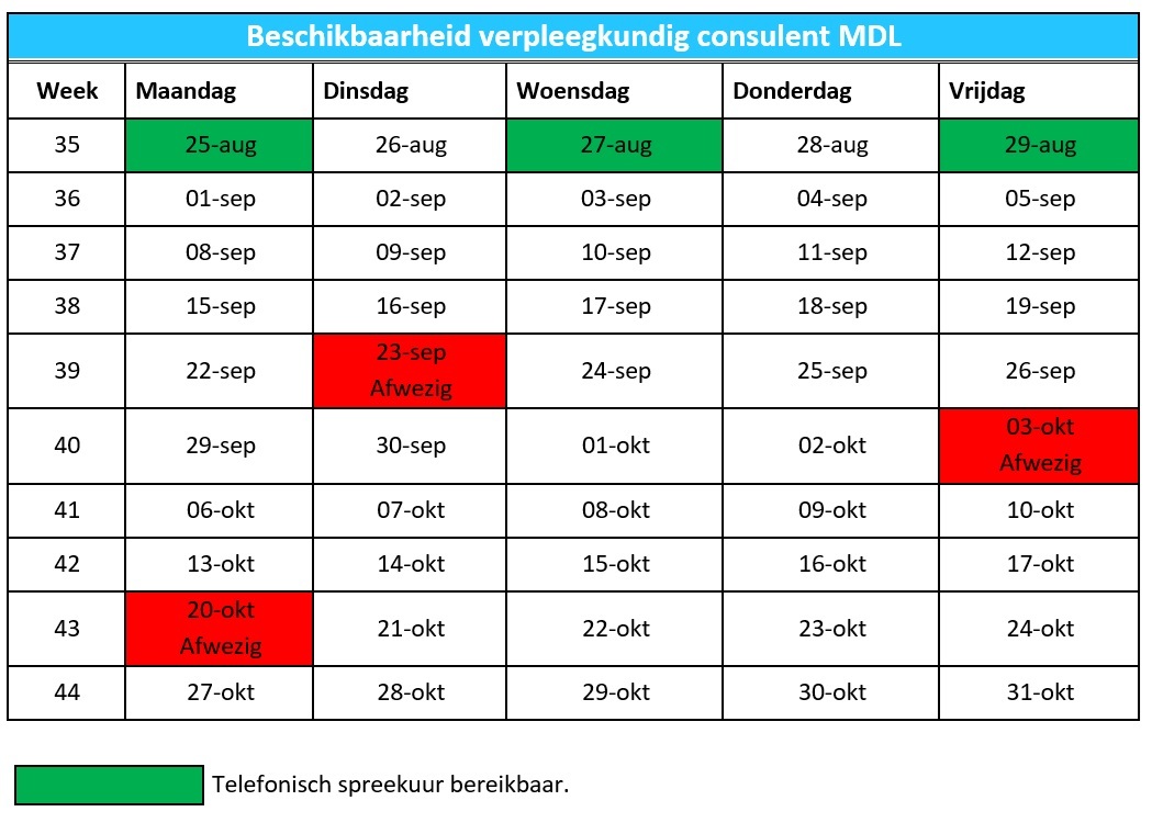 Wilt u telefonisch contact met een van de gespecialiseerde verpleegkundigen? Bel dan met het secretariaat van de poli MDL in Leeuwarden. Zij zijn elke werkdag bereikbaar van 08.30 tot 12.00 uur en van 13.00 tot 16.30 uur op telefoonnummer 058-286 6950.