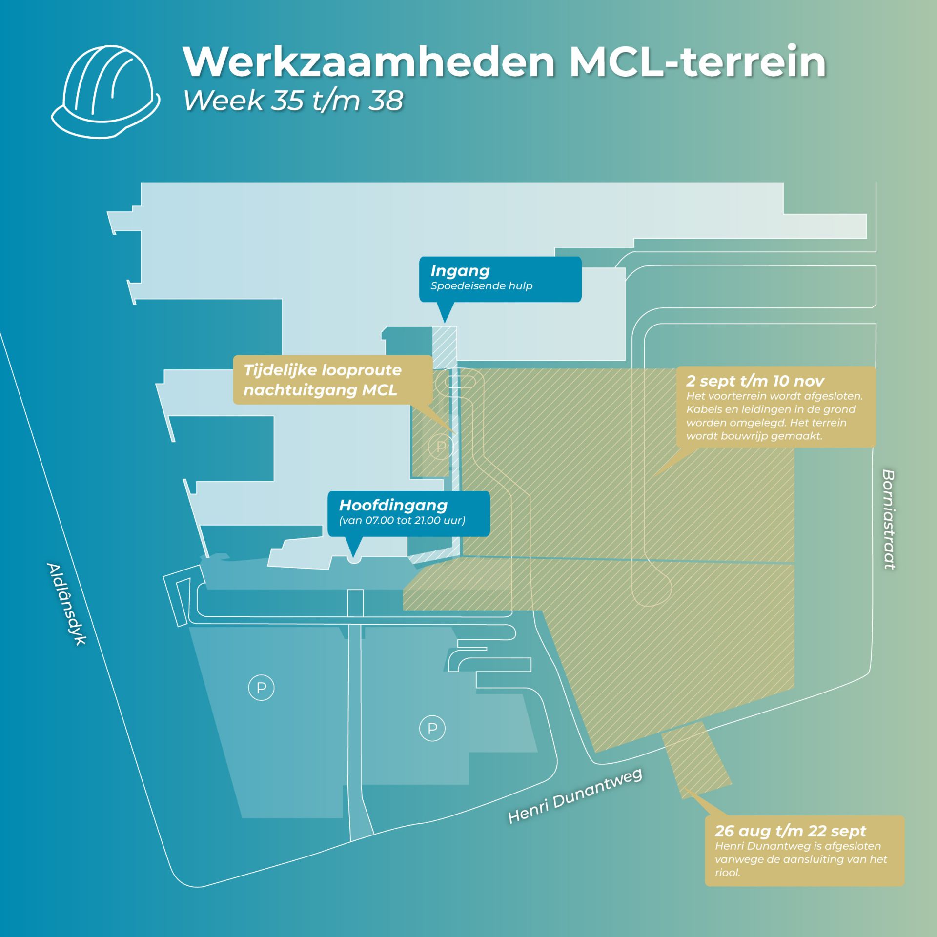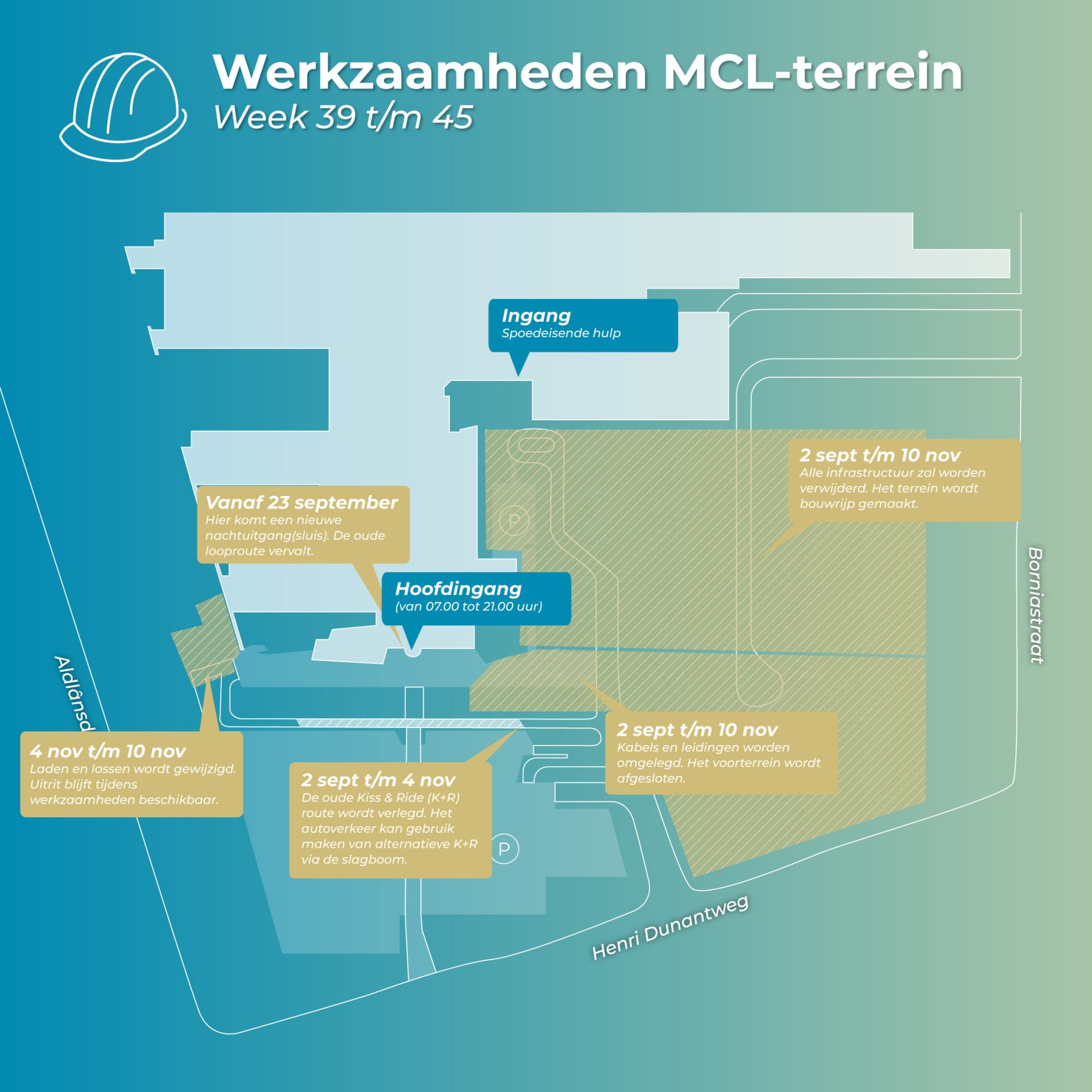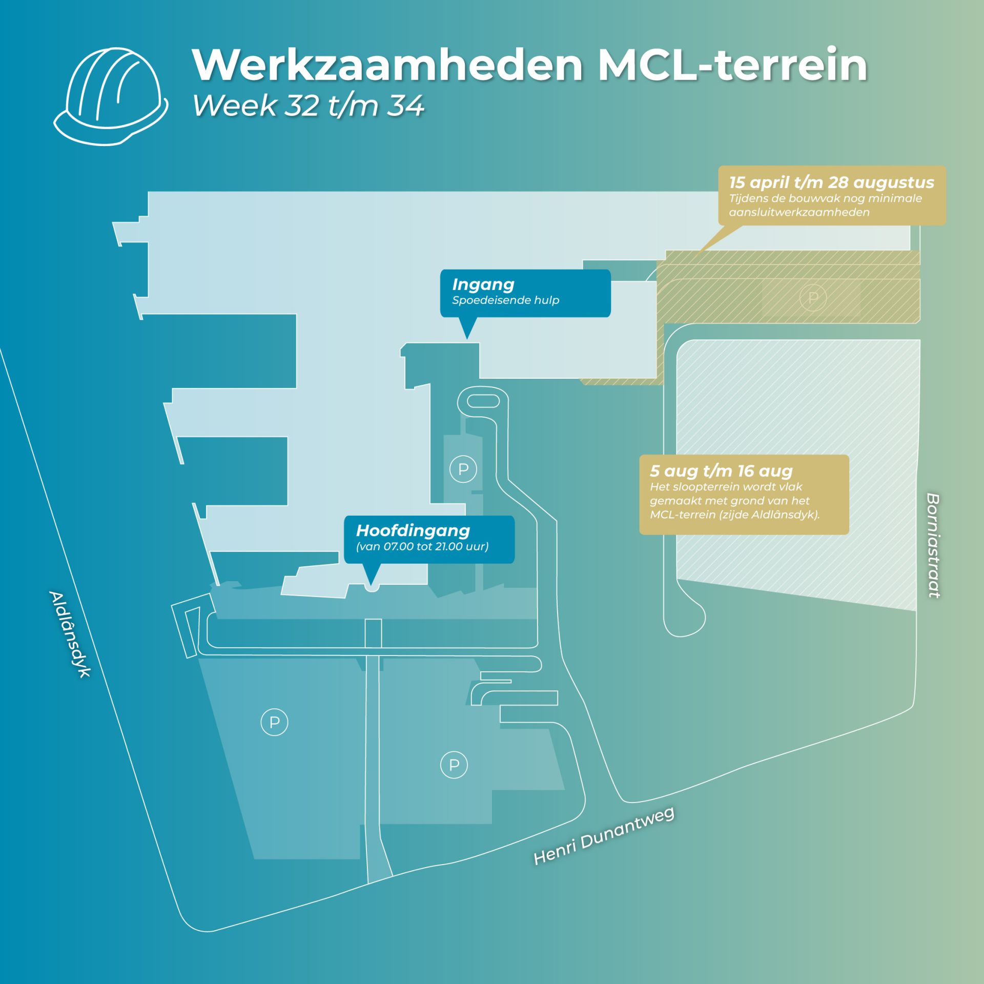 Het slopen op en rondom het MCL-terrein is klaar en de nieuwe toegangsweg naar de spoedeisende hulp en dokterswacht wordt vanaf 28 augustus in gebruik genomen. Voor we van start kunnen met de nieuwbouw, moeten we het terrein de komende periode verder klaarmaken voor de bouw. Benieuwd wat we allemaal gaan doen? Bekijk onderstaande plattegronden.