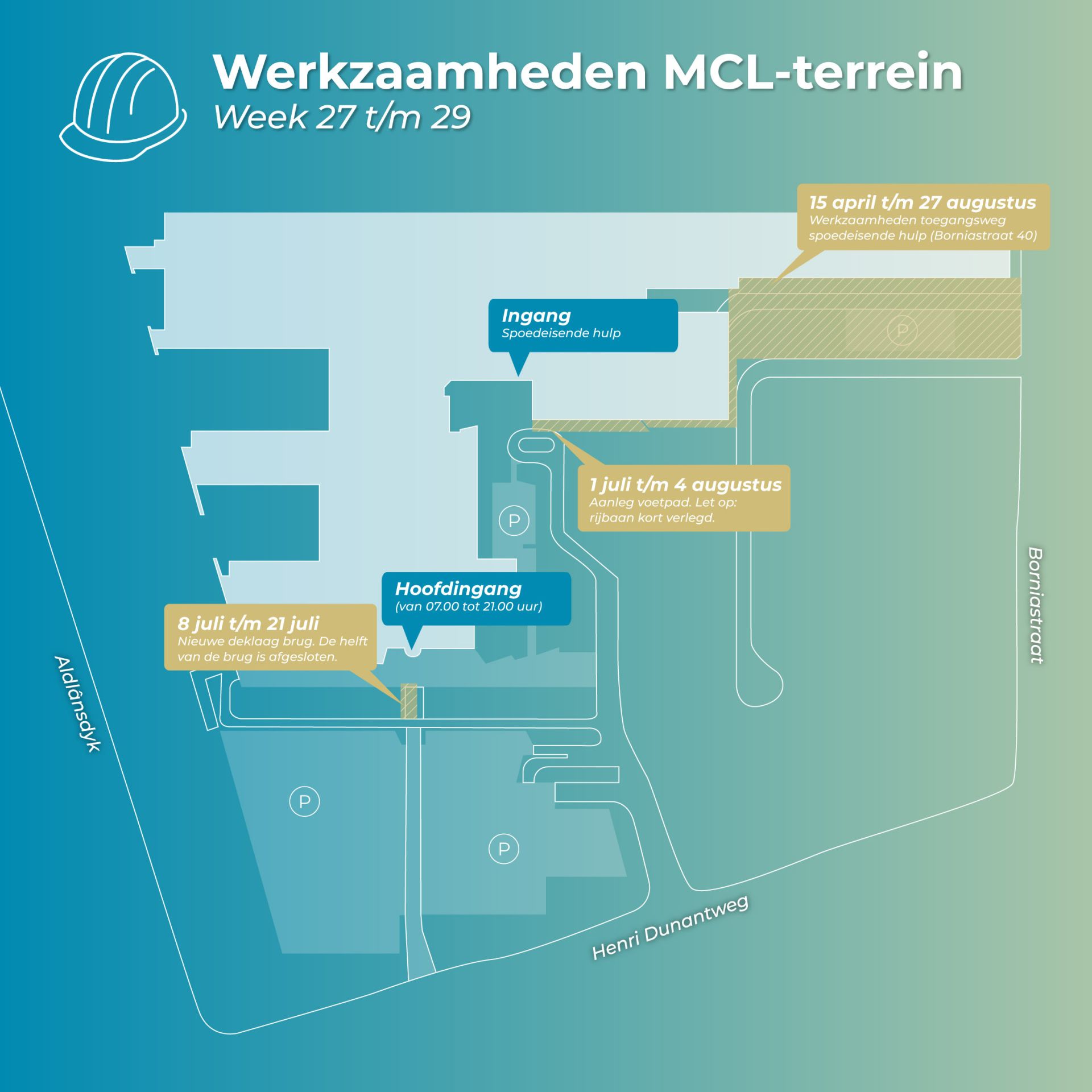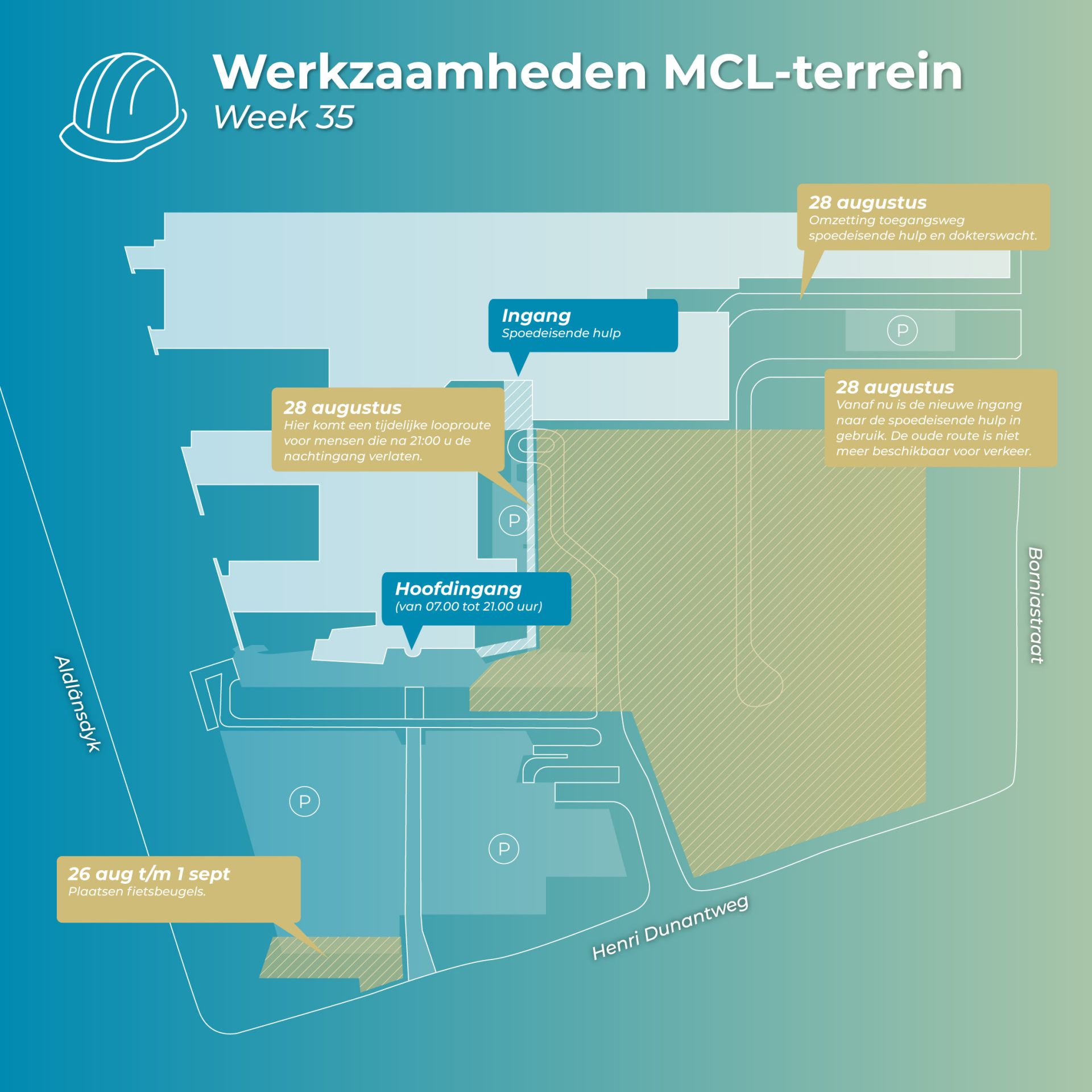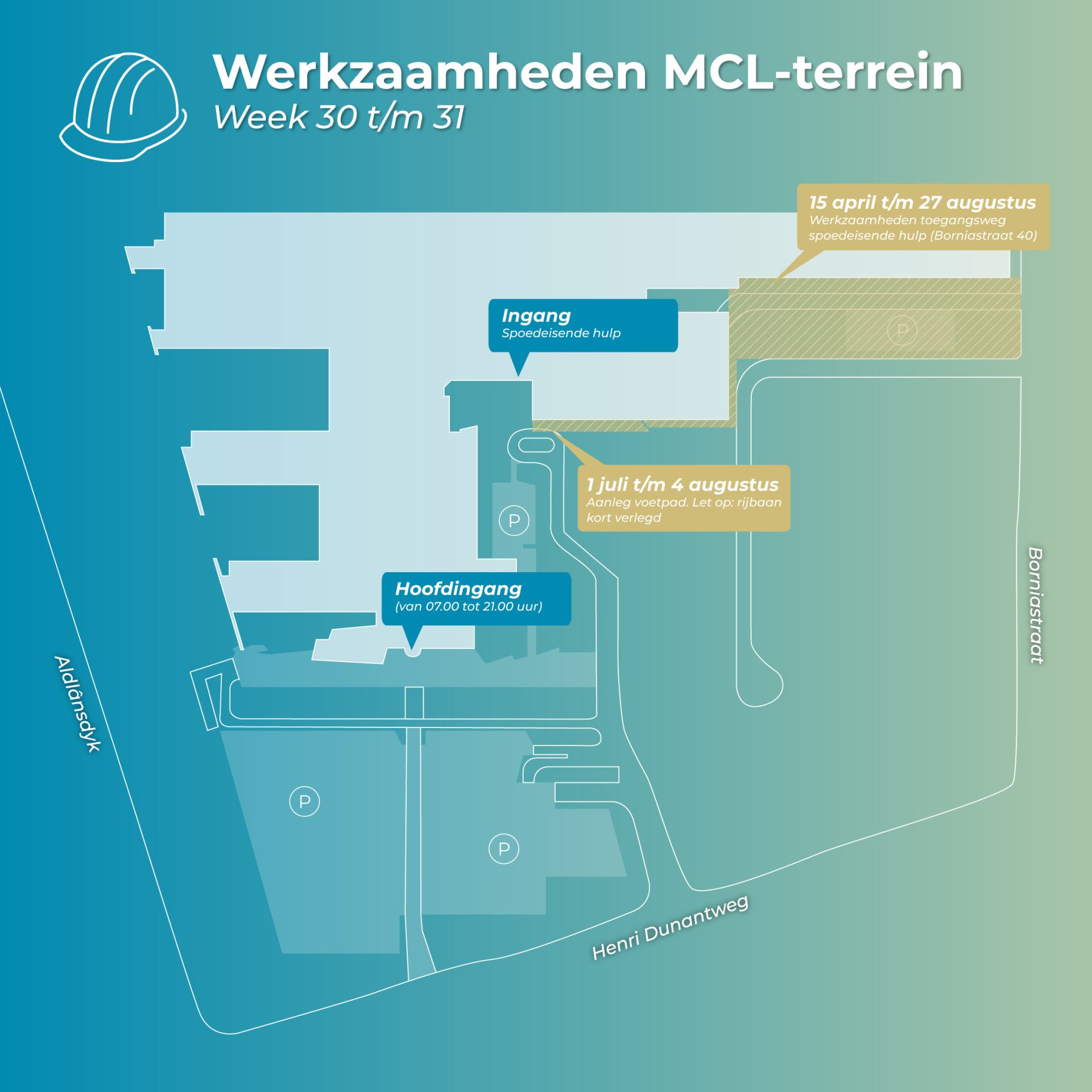 Het slopen op en rondom het MCL-terrein is klaar en de nieuwe toegangsweg naar de spoedeisende hulp en dokterswacht wordt vanaf 28 augustus in gebruik genomen. Voor we van start kunnen met de nieuwbouw, moeten we het terrein de komende periode verder klaarmaken voor de bouw. Benieuwd wat we allemaal gaan doen? Bekijk onderstaande plattegronden.