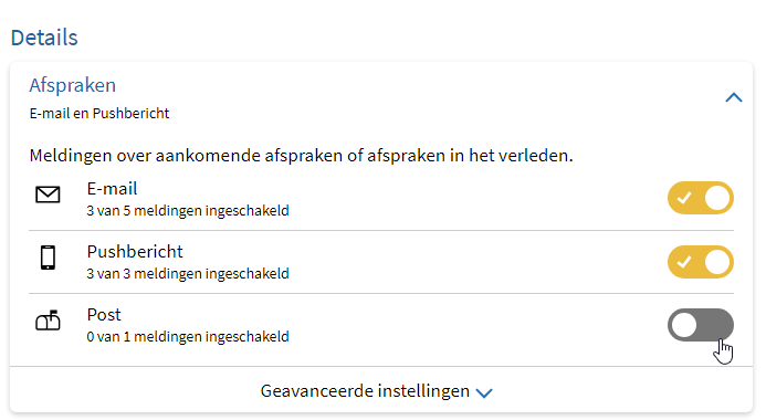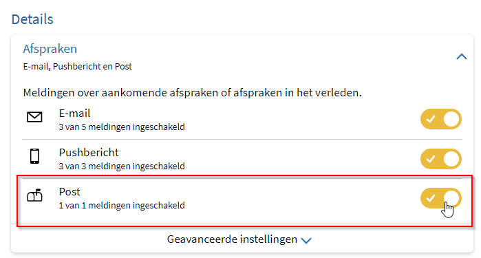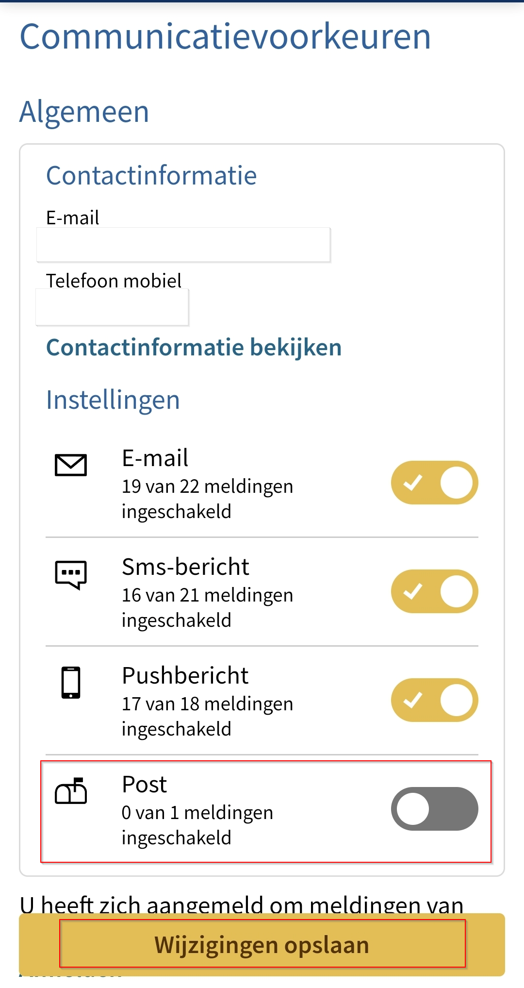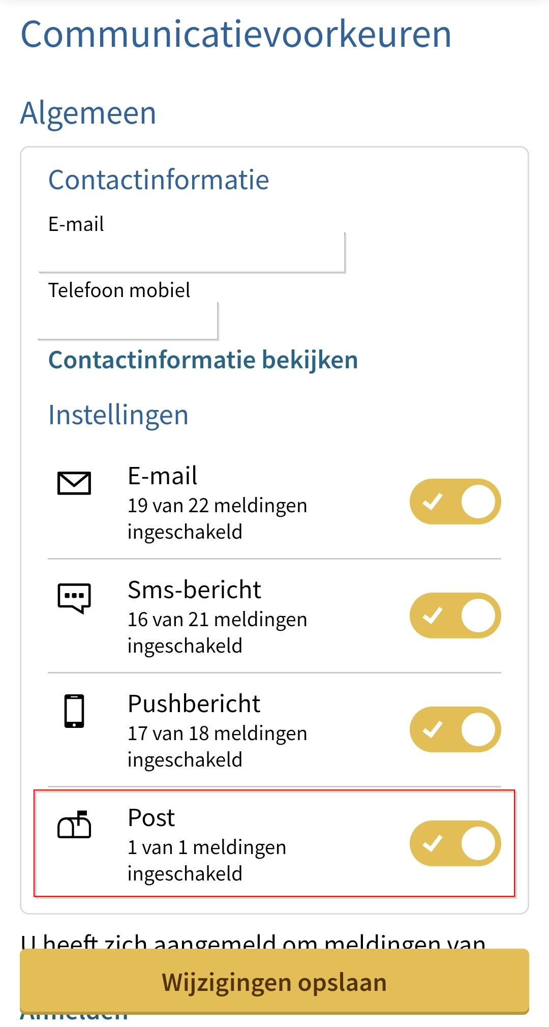 3. Druk op het schuifje bij post. Deze wordt dan grijs. Belangrijk! Klik daarna op “wijzigingen opslaan, onderaan het scherm: