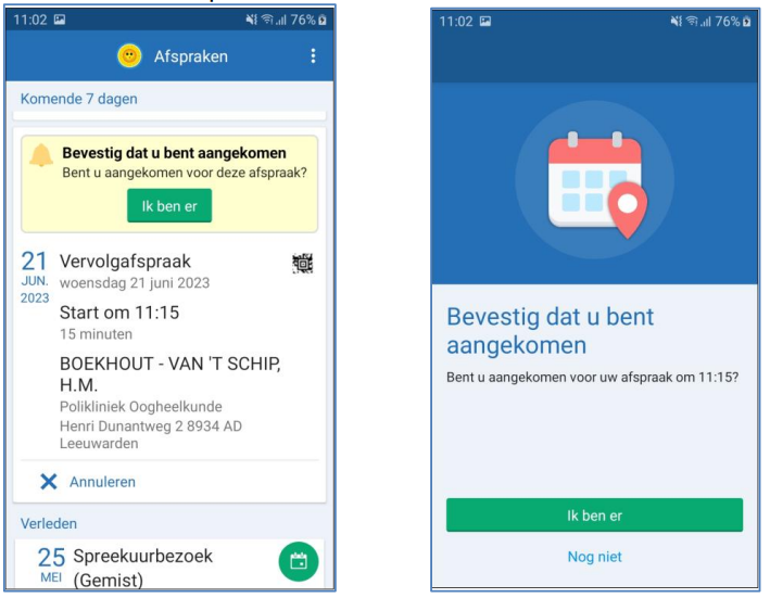 - Daar opent u de mijnMCL-app op uw mobiele telefoon. Bij uw afspraak staat een knop waarmee u uw aankomst kunt bevestigen (zie afbeelding hieronder).