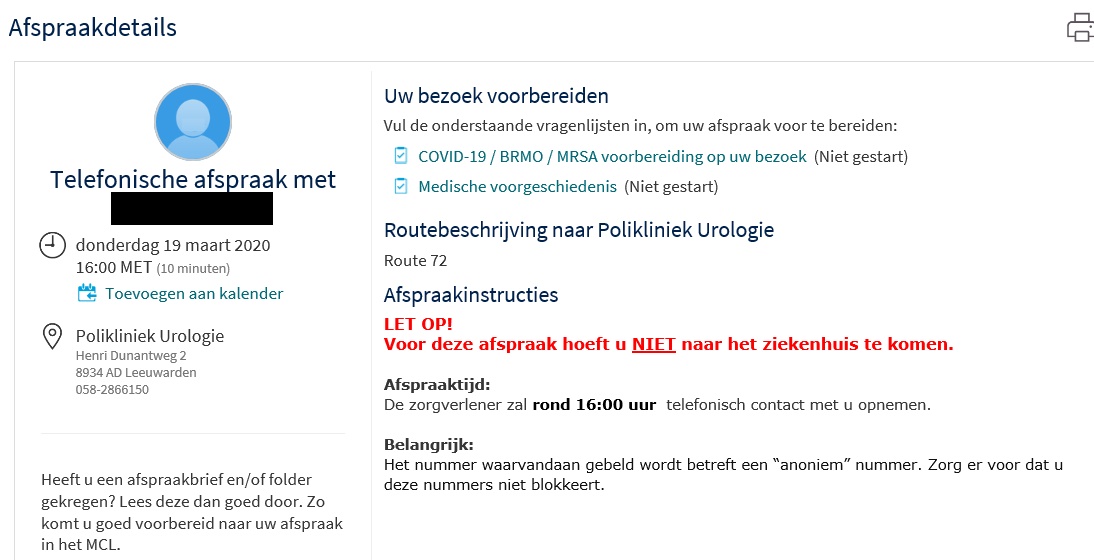 Vanaf 16 maart j.l. zijn nu ook alle telefonische afspraken zichtbaar in mijnMCL. De afspraken waren eerder niet zichtbaar omdat dit verwarring gaf. Patiënten kwamen soms toch naar het MCL hun afspraak. Door enkele technische aanpassingen is nu duidelijker gemaakt dat de patiënt niet naar het MCL hoeft te komen.