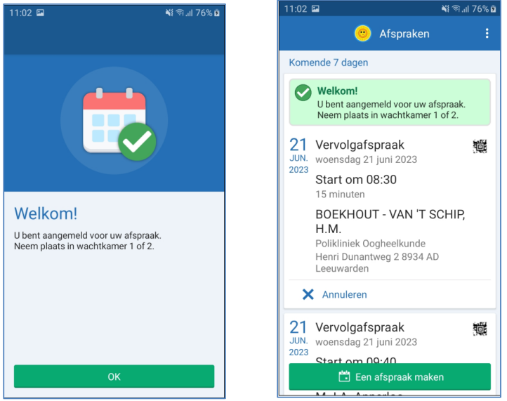 Inchecken via de app is mogelijk vanaf 10 minuten voor uw afspraaktijd. Dus als u langer dan 10 minuten van te voren aanwezig bent, is bovenstaande nog niet te zien in de app. Ook als u te laat bent, is inchecken via de app niet meer mogelijk. NB: tot 24 oktober 2023 was het mogelijk vanaf 30 minuten voor de afspraak in te checken, op 24-10 is dit aangepast naar 10 minuten.