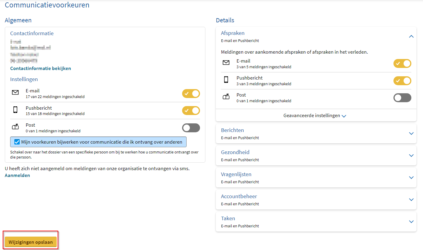 - Bij “Communicatievoorkeuren > Gezondheid” kunt u aangeven dat u maar 1 keer per dag een melding wilt krijgen van nieuwe onderzoeksuitslagen.