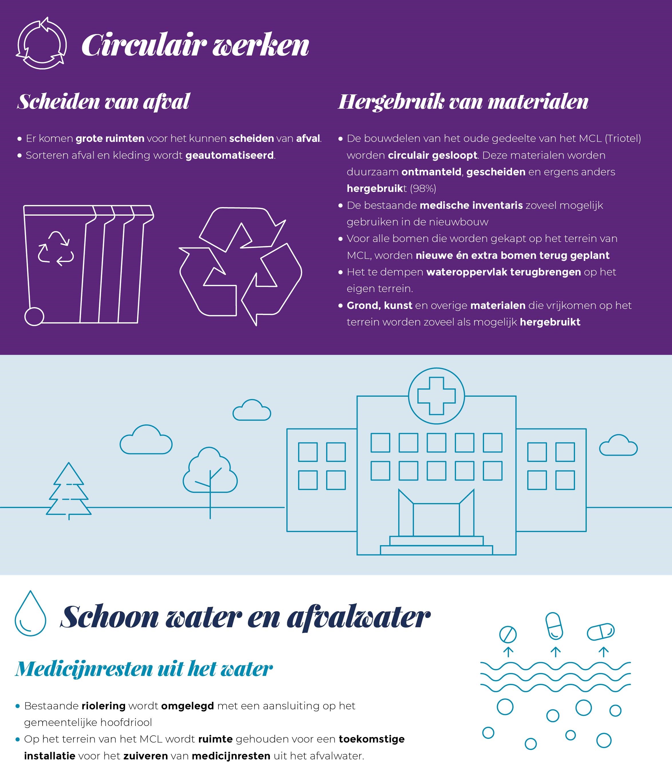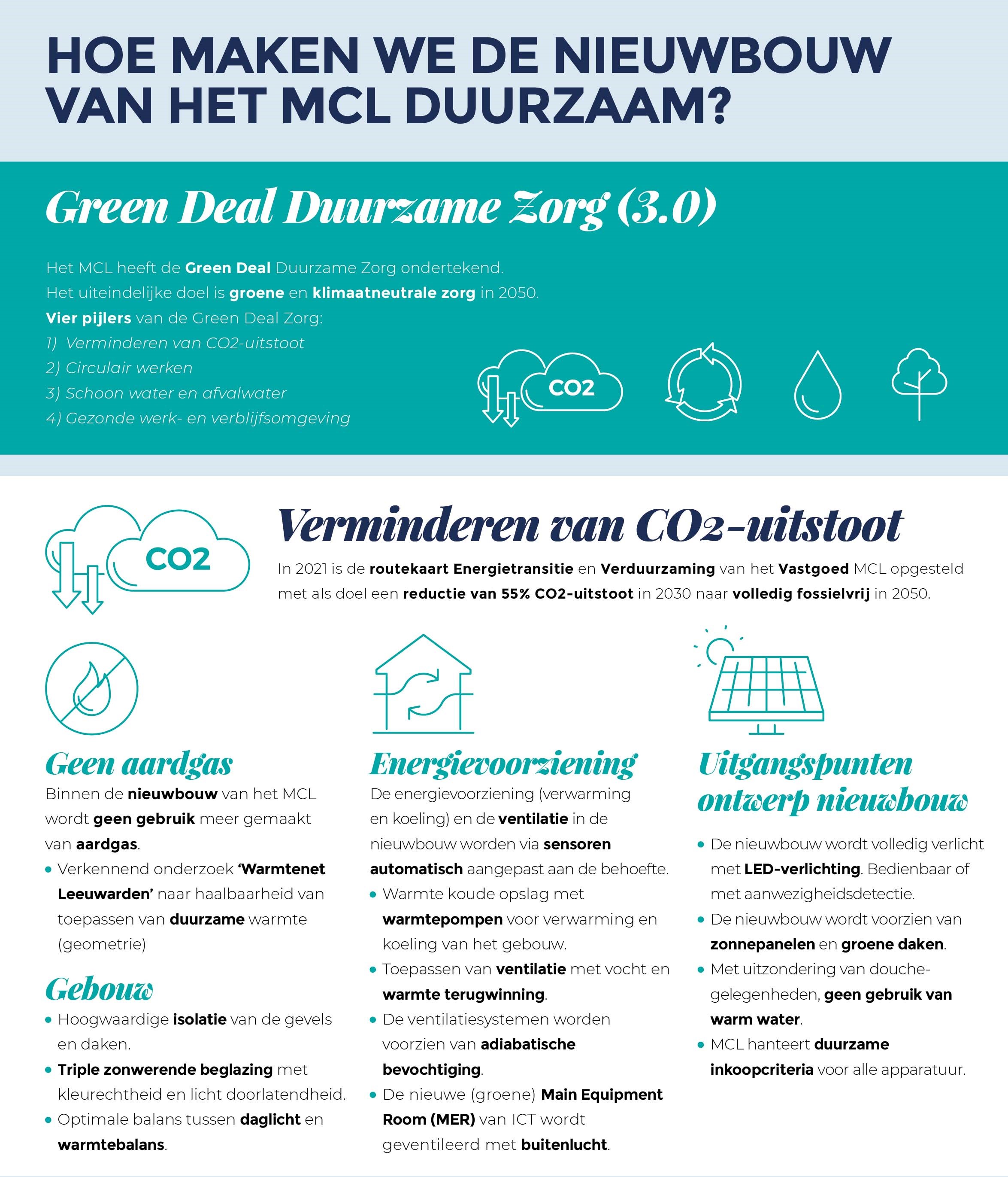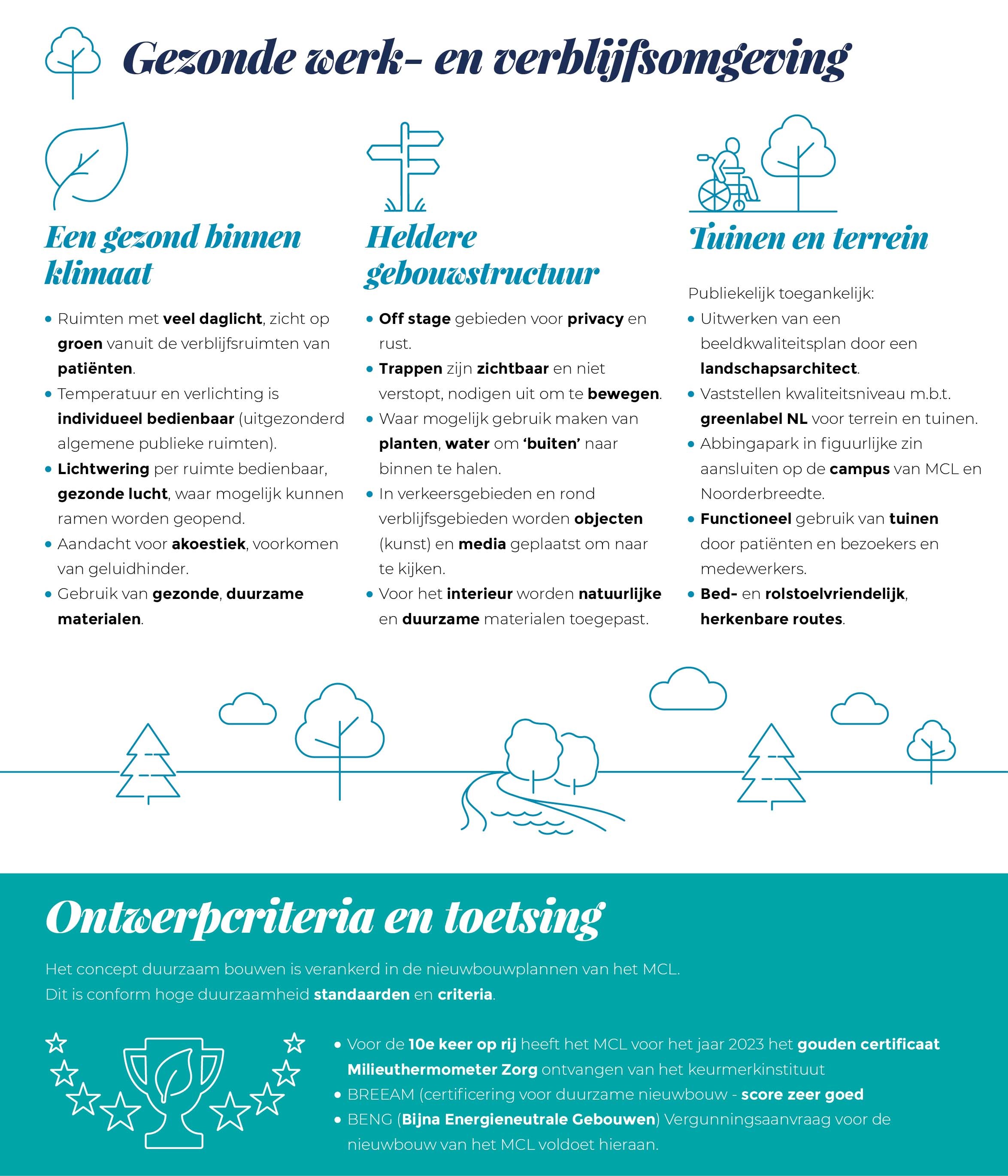 Met de nieuwbouw kan het MCL de CO2-uitstoot sneller omlaag brengen: in 2030 al met 55 procent, in 2050 volledig. In het nieuwe MCL - en tijdens de bouw hiervan - wordt bovendien ‘circulair gewerkt’: er worden zo min mogelijk nieuwe grondstoffen gebruikt, er vindt zo min mogelijk vervuiling plaats. Van der Geest benadrukt dat duurzaamheid binnen de nieuwbouw echter meer betekent dan het ontlasten van het milieu: “Een gezond makende leef- en verblijfsomgeving creëren voor onze patiënten, bezoekers en medewerkers is minstens zo belangrijk. Bijvoorbeeld door het ziekenhuis zo groen mogelijk in te richten, te voorzien van de juiste hoeveelheid daglicht en mensen uitnodigen om te bewegen. Kortgezegd komt het nieuwe, duurzame MCL straks tegemoet aan de behoeften van de huidige generatie, zonder dat de toekomstige generaties tekort worden gedaan.”